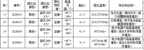 上表中的SL3029黑色灌封膠的耐溫短時(shí)間,可以到200度長(zhǎng)期,短時(shí)間能耐溫到250度,而且可以常溫或中溫固化,這在灌封膠中不多見(jiàn),很有特色。