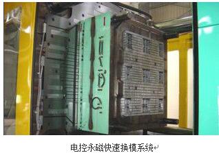 電控永磁快速換模系統(tǒng)主要是針對(duì)傳統(tǒng)注塑機(jī)、沖床、合模機(jī)裝夾模具時(shí)間長,操作復(fù)雜,安全性低而設(shè)計(jì)的,該系統(tǒng)采用電控永磁模板及動(dòng)模板,只需經(jīng)過簡單的充退磁動(dòng)作,就能裝夾和更換模具,真正做到3分鐘換模,它既可以安裝到新機(jī)中,作為標(biāo)準(zhǔn)配置銷售給終客戶,也可以對(duì)正在使用機(jī)臺(tái)進(jìn)行改造,使傳統(tǒng)機(jī)臺(tái)具有3分鐘快速換模功能而不會(huì)改變?cè)瓉頇C(jī)臺(tái)的結(jié)構(gòu),即實(shí)用又方便。那么
