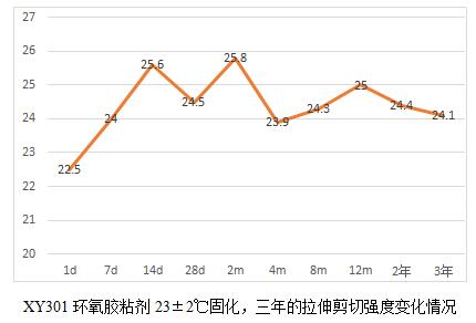 XY304的3年內(nèi)剪切強(qiáng)度變化平緩,且3年的數(shù)據(jù)相比較早的基礎(chǔ)數(shù)據(jù)還有所提高,強(qiáng)度并未降低。XY301和XY302的剪切變化有起伏,但是波動(dòng)不大均在15%的范圍,且均相比基點(diǎn)數(shù)據(jù)要高,也說明室溫下的環(huán)氧膠完全固化達(dá)到最終強(qiáng)度的時(shí)間較長(zhǎng),膠接強(qiáng)度前期會(huì)隨著時(shí)間的增長(zhǎng)而有所增長(zhǎng)。