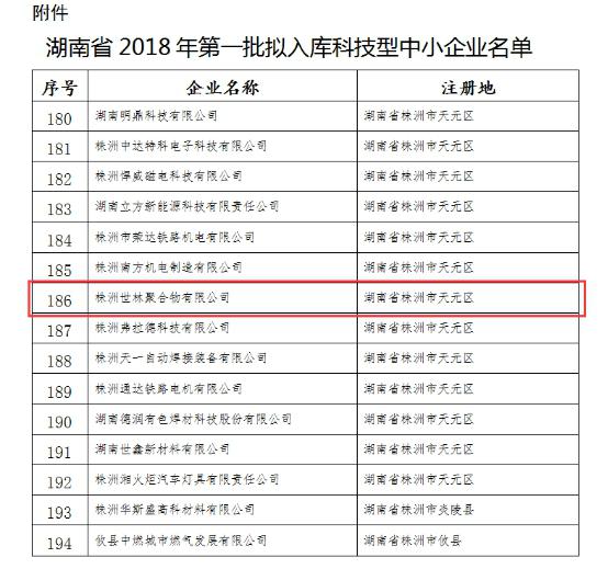 根據(jù)《科技型中小企業(yè)評價辦法》(國科發(fā)政〔2017〕115號)和《科技型中小企業(yè)評價工作指引(試行)》(國科火字〔2017〕144號)有關(guān)規(guī)定,經(jīng)企業(yè)自主評價、評價機構(gòu)審核,現(xiàn)將湖南省2018年批194家擬入庫科技型中小企業(yè)名單(名單見附件)予以公示,株洲世林聚合物有限公司(世林膠業(yè))也榮獲在內(nèi)。